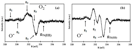 Based on previous findings, we made the assumption that the photocatalytic activity of PMMA + TOCs samples is a result of their photoexcitation, leading to the generation of reactive oxygen species (ROS) [51,52,53,54,55]. Additionally, this effect is combined with the photoactivated reduction of Ti(IV) to Ti(III) [52,53,54]. To confirm the aforementioned phenomenon, we recorded EPR spectra of PMMA + TOCs (TOCs = (1) and (2)) samples (Figure 8). In the EPR spectrum of PMMA + (1), we observed anisotropic signals corresponding to O2− and O− radicals, as well as Ti(III) (Figure 8a and Table 5). It is worth noting that some lines, particularly g2 for both oxygen species, may overlap. The formation of O2− and O− paramagnetic centers involves electron removal and stabilization of the resulting radical through the reduction of Ti(IV) to Ti(III) [51,52]. According to the literature, the maximum g-factor for O2− is higher compared to O− species [53]. For the PMMA + (2) composite, we obtained an EPR spectrum with improved resolution (Figure 8b), revealing the characteristic signal attributed to O− paramagnetic species. However, the presence of O2− radicals cannot be entirely ruled out; their content on the sample surface is likely much lower. The electron transfer between Ti(IV) and Ti(III) was also confirmed in this sample. Similar spectral patterns were observed for the PMMA + (5) 20 wt.% composite in previous studies (Table 5) [35]. In the case of the PMMA + (4) 20 wt.% sample, the EPR spectrum indicated the presence of O2−, O−, and possibly Ti(III) forms, consistent with the results obtained for a composite containing a {Ti6O4} core built by Ti3O subunits. The signals observed in the PMMA + (4) 20 wt.% sample was relatively weak and exhibited a rapid decrease in intensity over time, indicating lower stability of the {Ti3O} core compared to other cores. It is important to note that other oxygen-based radicals, such as peroxy-type radicals (RCOO•) and organic-type adducts of O2−, could potentially be indistinguishable from the superoxide radical anion (O2−) using CW-EPR spectroscopy. However, this scenario is unlikely as the first two forms are unstable at room temperature and can only be detected at lower temperatures [55].