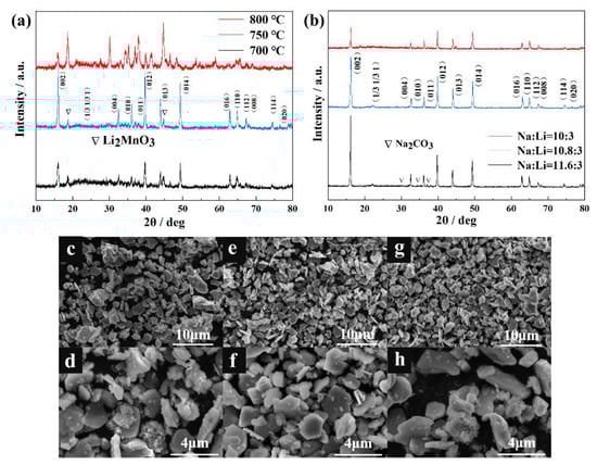 XRD patterns of the P2-type NLNCM precursor synthesized at different sintering temperatures (a) and with different Li/Na ratios (b). SEM image of the P2-type NLNCM precursor synthesized with Li/Na = (c,d) 10:3, (e,f) 10.8:3, and (g,h) 11.6:3, respectively.