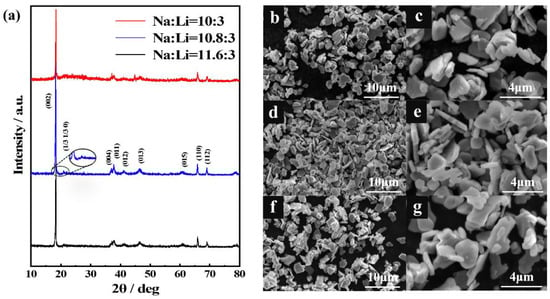 Following the ion exchange process, the transition metal layer will slip along the (2/3, 1/3, z) or (1/3, 2/3, z) direction and the layer spacing changes, and Li+ occupies the Li-O octahedral position, completing the transformation of the material from the P2 phase to the O2 phase, respectively [14,35]. Figure 2a shows the XRD patterns of the cathode materials obtained following the ion exchange process of the precursors prepared with different Li/Na ratios. The peak positions of each material can be indexed to the O2-type layered structure with the P63/mmc space group. The material with Na:Li = 10.8:3 was found to have the sharpest peak intensity, indicating the highest crystallinity. For the remaining two materials, the impurity-related peaks disappeared due to the ion exchange and water washing processes. As shown in Figure 2b–g, all the assessed materials displayed smoother surfaces compared to their corresponding precursors, and only trace amounts of fine particles remained.