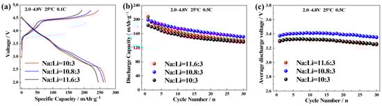 The electrochemical properties of the materials prepared with different Li/Na ratios are shown in Figure 3. Figure 3a shows the initial charge/discharge curves. When Na:Li = 10:3, the material exhibited a higher discharge specific capacity, which may be due to the small amount of independent Li2MnO3 impurities that were still present in the material, which provide part of the capacity during the first cycle of charging and discharging. Meanwhile, when Na:Li = 11.6:3, the O2 phase was not highly crystalline, and the Li2MnO3 component in the bulk phase was determined to be less, resulting in a lower discharge capacity. Figure 3b,c demonstrates the cycling performance and the average discharge voltage for a current density of 0.5 C and a voltage range of 2.0–4.8 V. Although the capacity of the material was high when Na:Li = 10:3, the capacity then decayed rapidly due to the poor reversibility of the Li2MnO3 structure; the capacity retention rate was calculated to be 67.4% after 30 cycles. When Na:Li = 10.8:3, the capacity retention rate reached 75.8% at a high capacity due to the proper ratio. When Na:Li = 11.6:3, the capacity retention, although also higher, accompanied a lower capacity. As shown in Figure 3c, compared with the conventional O3-type material, the voltage decay of the O2-type material prepared under all three conditions was found to be insignificant, and the voltage decay of the material with Na:Li = 10.8:3 was only 0.0233 V [36,37], with the voltage decay of the material with Na:Li = 10:3 only being 0.0439 V in comparison. The dQ/dV curves of the first three cycles of the materials prepared with the different Na/Li ratios are shown in Figure S1. A clear oxidation peak appeared for the three materials during the first cycle of charging to 4.6 V, with the peak then disappearing in both the second and third cycles, indicating that these materials experience an irreversible oxygen loss during the first charge and discharge. Meanwhile, when Na:Li = 10:3, the oxidation peak of the second cycle was significantly shifted compared with the first cycle, indicating its inferior structural reversibility.