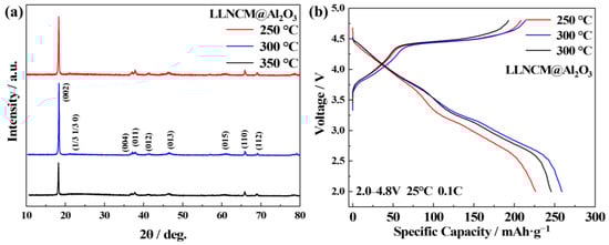 (a) XRD patterns and the (b) initial charge/discharge curves of the LLNCM@Al2O3 cathode material’s handling under different annealing temperatures.