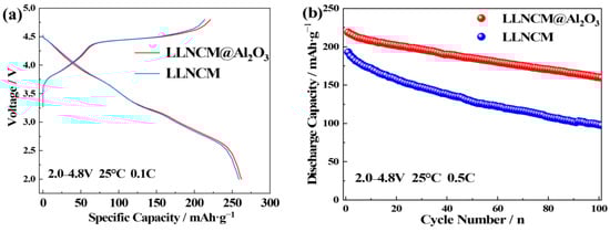 The LLNCM and LLNCM@Al2O3 electrochemical performance were assessed using 2032-type coin cells with metallic lithium foil as the anode. The cathode electrode was fabricated with 80 wt.% cathode material, 10 wt.% acetylene black, and 10 wt.% polyvinylidene difluoride (PVDF) binder on an Al foil. The assembled battery was then assessed for its electrochemical performance in the voltage range of 2.0–4.8 V at 25 °C.