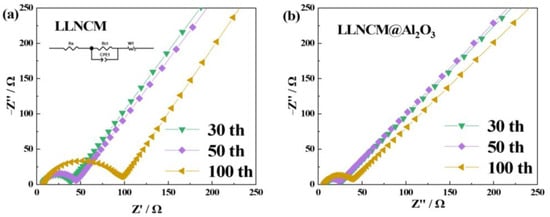 Figure 7 shows the impedance spectra of LLNCM and LLNCM@ Al2O3 that were formed at different numbers of cycles. The data were fitted by the equivalent circuit diagram in Figure 7a, where Rs represents the solution impedance and Rct is related to the surface film and the surface charge transfer.