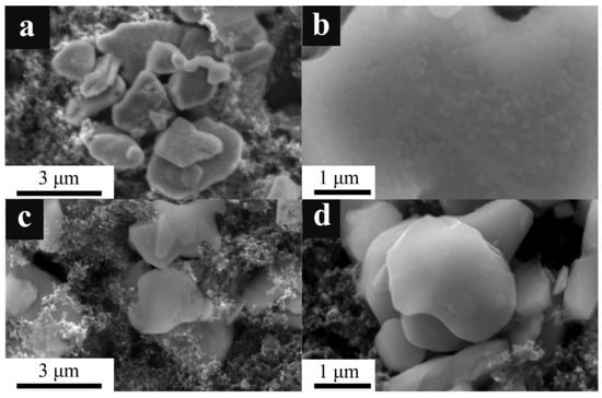 SEM image of the (a,b) LLNCM and (c,d) LLNCM @Al2O3 materials after cycling.