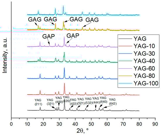 As one can see from Figure 1, the YGdAG:Ce samples with the percentage of substitution of Y by Gd not exceeding 30% consist of the pure yttrium-aluminum garnet phase, which corresponds to the result obtained earlier in [15] for the YAG:Yb,Gd nanopowders. The XRD peaks of YAG slightly shift to the lower Bragg angles. Thus, in the case of relatively low concentration, gadolinium incorporates the YAG crystal structure without the formation of other phases.