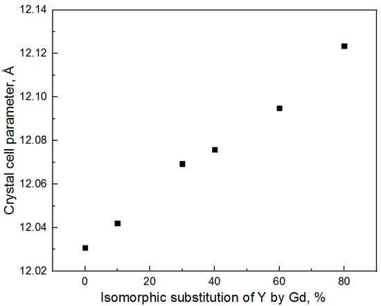 As one can see from Table 3, no influence of gadolinium on the average size of nanocrystals is observed. The dependence of the crystal cell parameter on the degree of isomorphic substitution of Y by Gd is shown in Figure 2. The crystal cell parameter was determined for the YAG phase using Rietveld refinement.
