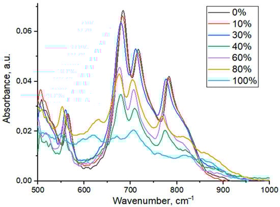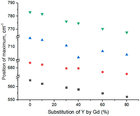 The dependence of the maxima positions on the degree of isomorphic substitution of yttrium by gadolinium is almost linear in the range of Gd content 0–60%. This linear shift of peaks maxima positions confirms the gadolinium incorporation into the YAG structure, which leads to distortion of crystal structure and change in frequencies of vibrations. However, the observed shift at 60–80% substitution of yttrium by gadolinium is less prominent, probably, due to the formation of other phases. Since their FTIR bands overlap with the bands of the YAG phase, the results obtained for samples with 60–100% of Y-Gd substation are difficult to be analyzed.