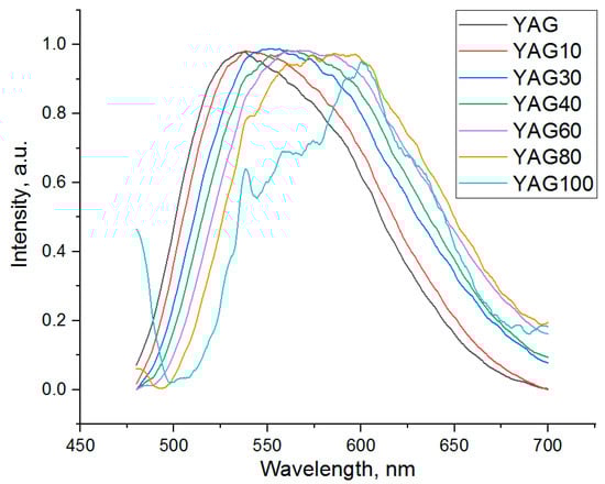 The luminescence spectra of the cerium-doped garnet nanopowders with different percentages of substitution of Y by Gd are presented in Figure 6. The wavelength of excitation light is 450 nm. The spectra were normalized to (0.1). The luminescence band of the YAG100 sample is distorted because of the low signal-to-noise ratio. Its lower intensity in comparison with other samples might be the reason for this phenomenon.