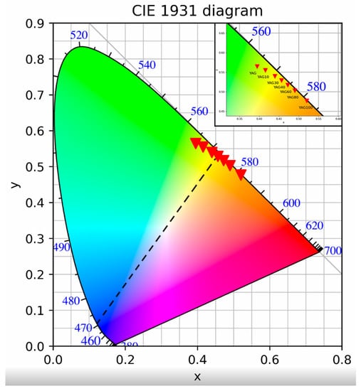 The point which represents the color coordinates of a mixture of colors lies on the line connecting the points corresponding to these colors (Figure 7, dashed line). The x coordinate increases and the y coordinate decreases with the growth of gadolinium content. This change in chromaticity with an increase in Gd content is consistent with the data of [29] for YGdAd:Ce powders prepared by the urea combustion method; nevertheless, the y-coordinate of polymer–salt synthesized samples emission is lower. As one can see from Figure 7, the emission of samples with the degree of yttrium substitution by gadolinium 30–40% can be mixed with an emission of 470 nm (wavelength of blue LEDs) in order to fabricate white LEDs. Nevertheless, the precise value of the substitution degree is to be calculated based on the chromaticity of a specific LED since the LED emission spectrum is not monochromatic.