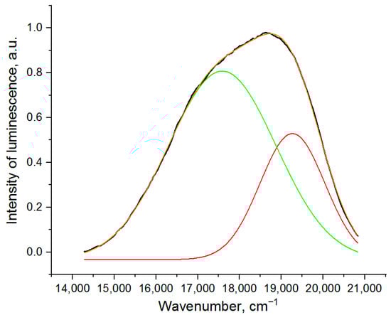 Structure of the luminescence band of the YAG sample (black line: experimental data, red and green lines: deconvoluted Gaussian peaks, orange line: sum of two Gaussian peaks).