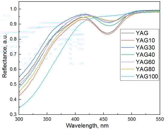 Two absorption bands (Figure 9) which are characteristic of cerium ions in the YAG matrix [71,72,73] are observed in the spectrum. Since the morphology of synthesized powders is the same and the same amounts of powders were studied, one can conclude that the intensity of the band with a maximum of about 450 nm tends to decrease with an increase in gadolinium concentration. The cerium absorption band in the YAG-100 sample is not present in Figure 9. Nevertheless, a low-intensity band in this spectral region is observed in the excitation spectrum. Thus, the sensitivity of diffuse reflectance spectroscopy does not allow registration of this band. The values of band maxima are presented in Table 4 (Section 3.7).