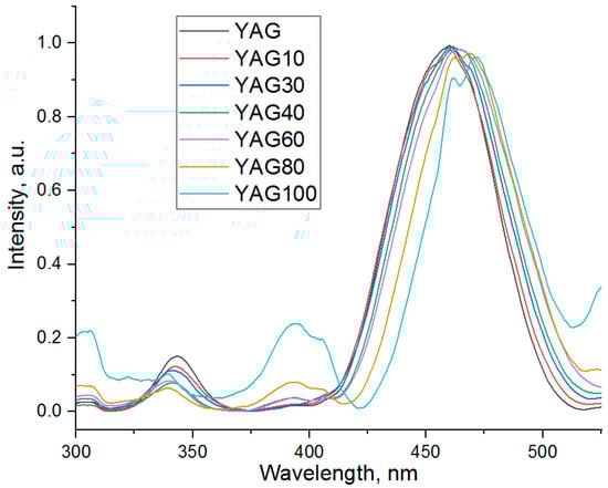 Two excitation bands with maxima at about 380 and 450 nm which are characteristic of cerium ions in the YAG matrix [60,71,74] are observed in Figure 10. These bands are due to the electronic transitions from the 4f ground state of cerium ions to 5d states, which are split by the crystal field [29]. An excitation band of YAP:Ce with a maximum of about 300 nm is observed in the spectrum [75]. The relative intensity of this band increases with an increase in gadolinium content. This result is consistent with XRD data which has shown that at higher concentrations of gadolinium, the peaks of the YAP phase are observed in X-ray diffraction patterns of YAG:Ce,Gd. With the increase in the degree of yttrium substitution by gadolinium the band with a maximum of 450 nm shifts to a longer wavelength, and the band with a maximum of 380 nm, on the contrary, shifts to shorter wavelengths.