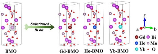As described in the introduction, γ-Bi2MoO6 can be represented by the general formula (Bi2O2)(MonO3n+1), where n = 1, in which the structure is formed by the interlacing of MoO6 octahedron and Bi-O layer (Bi2O2). As for the initial file of γ-Bi2MoO6 crystal, the cif file (mp-23064) is downloaded from the materials project resource library [38,39,40]. This crystal structure belongs to the orthorhombic structure, and the space group number is 29, corresponding to Pca21. The lattice parameters of the original file are a = 5.527 Å, b = 5.528 Å, c = 16.298 Å, α = β = γ = 90°, Vo = 497.973 Å3. The crystal structure contains two non-equivalent Bi3+ and one Mo6+ which bond with six non-equivalent O2−, respectively, forming the Bi2O2 tetrahedron and MoO₆ octahedra [38]. The 2 × 1 × 1 supercell is used to construct the model. The doping model of three rare earth metal ions is constructed by replacing Bi atoms near the center of the supercell system, which is named Ln-BMO (Ln=Gd, Ho, Yb), and the undoped system is named BMO. The structural models are shown in Figure 1.