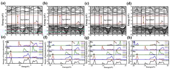 To determine the contribution of Ln atoms and other atomic orbitals to the electronic structure of BMO and Ln-BMO, the total density of state (TDOS) and the partial density of state (PDOS) are calculated, and the calculated results are shown in Figure 2e–h. For BMO, the Fermi energy from −20.0 eV to −15.0 eV is mainly contributed by O atoms; Mo atoms also contribute in the interval, and mainly come from [O] 1s and [Mo] 4d orbitals, while only [Bi] 6s orbital contributes near 10.0 eV. Secondly, from the energy of −6.0 eV to 0.0 eV in PDOS, Bi, Mo, and O can be found to participate in contribution, which can be composed of [O] 2p—[Mo] 4d and [O] 2p—[Bi] 6s orbital interactions [48]. The similar pattern accounts for the orbital contribution from 0.0 eV to 8.0 eV, which explains the formation of a conductive state between the [Bi] 6p, [Mo] 4d, and [O] 2p orbits.
