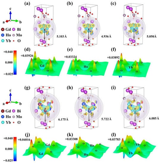 The differential charge density of (a) 0.25 Gd-BMO; (b) 0.25 Ho-BMO; (c) 0.25Yb-BMO. The 3D differential charge cross section of (d) (0 0 1) 0.25 Gd-BMO; (e) (0 0 1) 0.25 Ho-BMO; (f) (0 0 1) 0.25 Yb-BMO. The differential charge density of (g) 0.5 Gd-BMO; (h) 0.5 Ho-BMO; (i) 0.5Yb-BMO. The 3D differential charge cross section of (j) (0 0 1) 0.5 Gd-BMO; (k) (0 0 1) 0.5 Ho-BMO; (l) (0 0 1) 0.5 Yb-BMO.