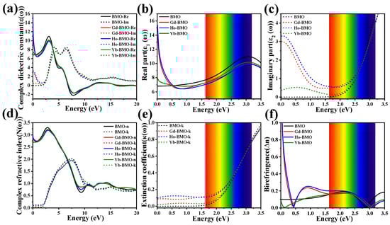 The complex refractive index and birefringence index of materials are important optical constants for analyzing the absorption spectrum. The parameters calculated according to Equations (5) and (6) are shown in Figure 4d,e and Figure S2d–f. The real part determines the propagation speed of light in the material, while the extinction coefficient of the imaginary part represents the attenuation of light propagation in the material, and also indirectly represents the absorption capacity of the material. The extinction coefficient is the main analysis part of the complex refractive index. Among them, the attenuation of Ln-BMO is enhanced in the infrared and visible regions, which further indicates that the doping of Ln3+ ions leads to the enhancement of the light absorption capacity in the intrinsic material. In particular, 0.5 Gd-BMO has the largest enhancement amplitude in the visible region, indicating that Gd3+ ion doping promotes the absorption of visible light and light response.