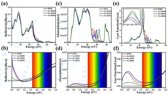 The reflectivity of BMO and 0.25 Ln-BMO: (a) full spectrum; (b) near the visible region. The absorption coefficient of BMO and Ln-BMO: (c) full spectrum; (d) near the visible region. The energy loss function of BMO and Ln-BMO: (e) full spectrum; (f) near the visible region.