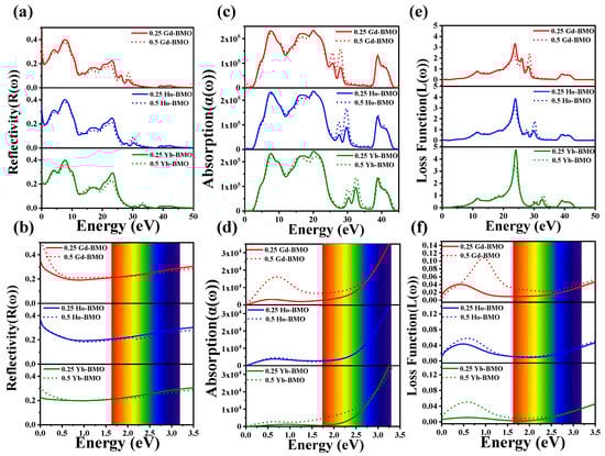 The reflectivity of 0.25 Ln-BMO and 0.5 Ln-BMO: (a) full spectrum; (b) near the visible region. The absorption coefficient of 0.25 Ln-BMO and 0.5 Ln-BMO: (c) full spectrum; (d) near the visible region. The energy loss function of 0.25 Ln-BMO and 0.5 Ln-BMO: (e) full spectrum; (f) near the visible region.