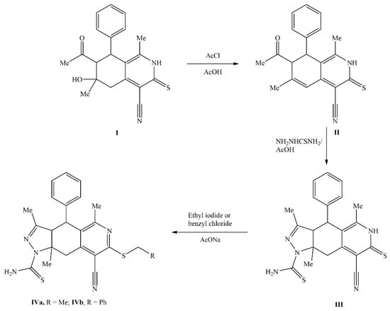 To a mixture of compound III (2.04 g, 5 mmol) and ethyl iodide or benzyl chloride (5 mmol) in ethanol (50 mL), sodium acetate trihydrate (0.75 g, 7 mmol) was added. The reaction mixture was heated under reflux for 2 h and then allowed to cool. The product that formed was collected and recrystallized from methanol to give white needles of compound IVa or IVb, respectively.