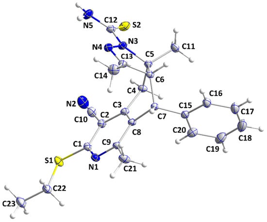 It was synthesized by using ethyl iodide; m.p.: 241–243 °C; Yield: 78%. IR (cm−1): 3448, 3251, 3131 (NH2); 3030 (C-H, sp2); 2967, 2910 (C-H, sp3); 2227 (C≡N); 1640 (C=N); 1587 (C=C). 1H NMR: δ 7.31–7.35 (m, 3H, Ar-H); 6.97–6.99 (d, J = 8 Hz, 2H, Ar-H); 6.74 (s, 1H, NH); 5.85 (s, 1H, NH); 5.33–5.37 (d, J = 8 Hz, 1H, CH); 4.63 (s, 1H, CH); 3.94 (s, 1H, CH); 3.28–3.32 (q, J = 8 Hz, 2H, SCH2); 2.51 (s, 3H, CH3); 2.35–2.39 (d, J = 16 Hz, 1H, CH); 2.08 (s, 3H, CH3); 1.85 (s, 3H, CH3); 1.41–1.43 (t, J = 8 Hz, 3H, SCH2CH3). Anal. Calcd. For C23H25N5S2 (435.16): C, 63.42; H, 5.78; N, 16.08%. Found: C, 63.21; H, 6.02; N, 16.31%.