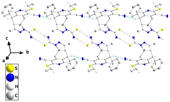 View of a portion of one ribbon of IVa projected onto (101). C—H···N and N—H···S hydrogen bonds are depicted, respectively, by light purple and light blue dashed lines, while non-interacting hydrogen atoms are omitted for clarity.