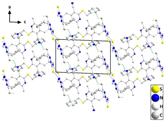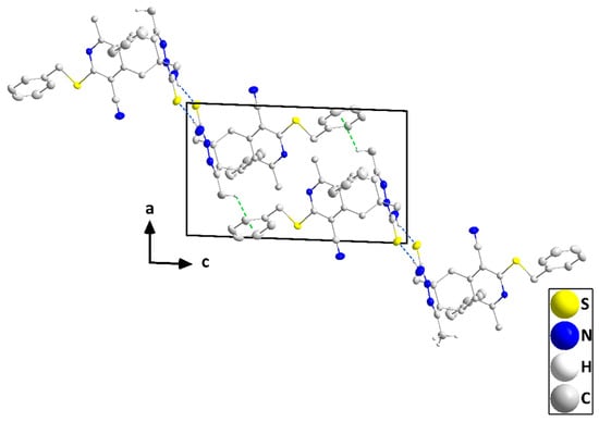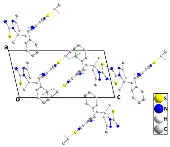 The molecule adopts a “pincer” conformation with the C3···C6 axis as the hinge (Figure 5). The orientation of the carbothioamide group, approximately in the plane of the N2/N3/C5/C4/C17 ring (N2—N3—C19—S2 torsion angle = −177.79(9)°), is partly determined by the intramolecular C6—H6B···S2 and C20—H20C···S2 interactions (Table 2 and Figure 5). A puckering analysis [21] of the C2···C7 ring gave the parameters Q = 0.6743(13) Å, θ = 86.80(10)°, and φ = 64.82(11)°. The mean planes of the N2/N3/C5/C4/C17 and the C11···C16 rings are inclined to that of the N1/C1/C2/C7/C8/C9 ring by 69.03(4) and 83.78(5)°, respectively, while the dihedral angle between the mean planes of the N1/C1/C2/C7/C8/C9 and C23···C28 rings is 63.13(5)°. However, the remainder of the benzylthio substituent is close to being coplanar with the N1/C1/C2/C7/C8/C9 ring (N1—C9—S1—C22 torsion angle is −5.53(12)°). In the crystal, inversion dimers are created by paired N4—H4A···S2 hydrogen bonds (Table 2) and are connected by weak C18—H18B···Cg5 interactions (Cg5 is the centroid of the C23···C28 ring; H18B···Cg5 = 3.03 Å, C18—H18B···Cg5 = 121°) into zigzag chains parallel to the ac plane and extending along its principal diagonal (Figure 6). The chains are packed with normal van der Waals interactions (Figure 7).