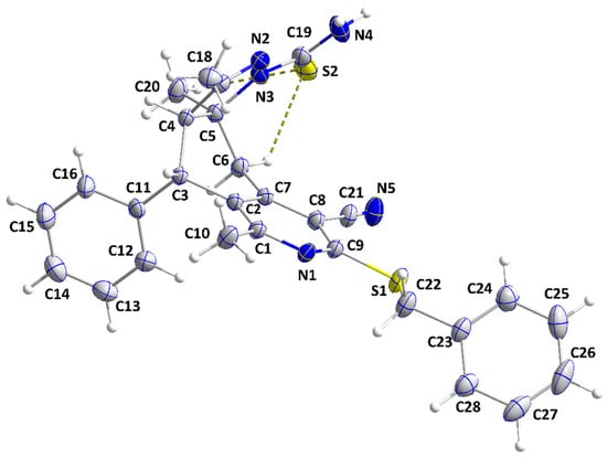 It was synthesized by using benzyl chloride; m.p.: 238–240 °C; Yield: 91%. IR (cm−1): 3437, 3253, 3134 (NH2); 3025 (C-H, sp2); 2960, 2904 (C-H, sp3); 2222 (C≡N); 1592 (C=C). 1H NMR: δ 7.45–7.47 (m, 2H, Ar-H); 7.28–7.34 (m, 6H, Ar-H); 6.96–6.98 (d, J = 8 Hz, 2H, Ar-H); 6.75 (broad s, 1H, NH); 5.83 (broad s, 1H, NH); 5.34–5.38 (d, J = 16 Hz, 1H, CH); 4.64 (s, 1H, CH); 3.93 (s, 1H, CH); 4.48–4.57 (q, J = 12 Hz, 2H, SCH2); 2.54 (s, 3H, CH3); 2.34–2.38 (d, J = 16 Hz, 1H, CH); 2.08 (s, 3H, CH3); 1.85 (s, 3H, CH3). 13C NMR: δ 176.08, 160.92, 158.63, 154.77, 150.61, 137.25, 137.19, 129.28, 128.51, 127.55, 127.32, 126.63, 126.32, 114.19, 105.70, 77.41, 77.09, 76.77, 69.00, 64.77, 40.46, 34.70, 28.38, 22.03, 14.26 ppm. Anal. Calcd. For C28H27N5S2 (497.17): C, 67.57; H, 5.47; N, 14.07%. Found: C, 67.53; H, 5.43; N, 13.86%.