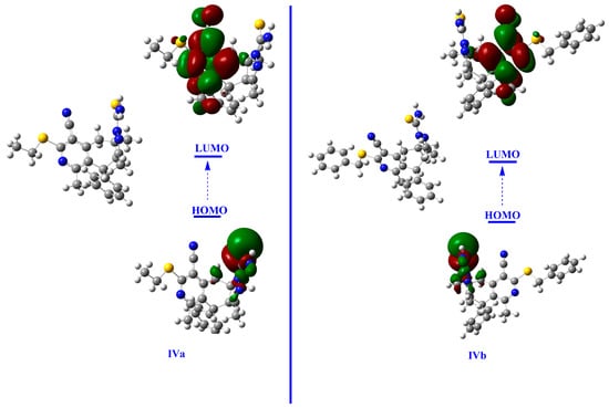 The frontier molecular orbital (FMO) study includes the energies of the highest occupied molecular orbitals (HOMO) and the lowest unoccupied molecular orbitals (LUMO) and the HOMO-LUMO gaps (EH-L). The HOMO energy of IVa is −5.64 eV, while that of IVb is −5.63 eV. The LUMO energies of IVa and IVb are, respectively, −1.78 and −1.80 eV. The occupied orbitals show nucleophilic behavior. The HOMO-LUMO gaps (EH-L) are, respectively, 3.86 and 3.83 eV for IVa and IVb (Table 3). The small HOMO-LUMO gaps indicate the soft nature and excellent reactivity of the studied compounds. The relatively low values of the HOMO-LUMO energy gaps show that both molecules have high chemical reactivity, biological activity, and polarizability. Both compounds have comparable HOMO-LUMO gaps, and their small values suggest a facile transfer of electrons from HOMO to LUMO, leading to enhanced optical properties. Electronic density plots of the HOMOs and LUMOs are shown in Figure 8. The HOMO density lies near the nitrogen and S-atoms of the ring, while the LUMO density is spread over the central part of compounds.