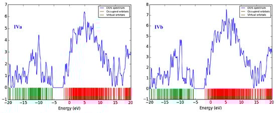 Density of states (DOS) spectra were also plotted over the energy range of −20 to 20 eV and show the newly generated states per unit energy for IVa and IVb (Figure 9). The green lines show the occupied molecular orbitals, while the red lines indicate unoccupied orbitals. The narrow HOMO-LUMO gaps indicate that charge transfer from a particular HOMO to LUMO takes place easily. Furthermore, the newly born energy states can be seen for HOMO (green lines) and LUMO (red lines) in the TDOS spectra. The blue curve on the spectra shows the intensity of peaks, which is higher for LUMO.