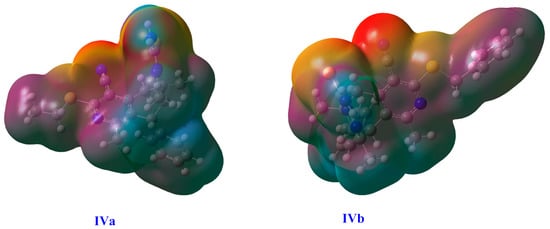 The molecular electrostatic potential (MEP) surface has frequently been used to generate the electrostatic potential (ESP) using a constant electron density for any chemical species. Three-dimensional MESP maps were generated for visualization of the reactive sites for IVa and IVb and are given in Figure 10. The red color represents an electron-rich region where an incoming electrophile can bind, while the blue color represents an electron-poor zone and a favorable place for nucleophilic attack. In IVa, the electron-rich regions lie near the nitrogen atoms of the tetrahydroisoquinoline moiety and the five-membered ring (Figure 10). For IVb, the red color also appears around the N-atom of the tetrahydroisoquinoline moiety, showing this to be the high electron density region (Figure 10).