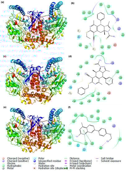 Best docked poses of the protein-ligand complex and its corresponding ligand plot (a,b) with IVa, (c,d) with IVb, and (e,f) with M16 (native ligand).