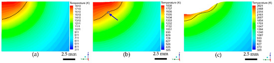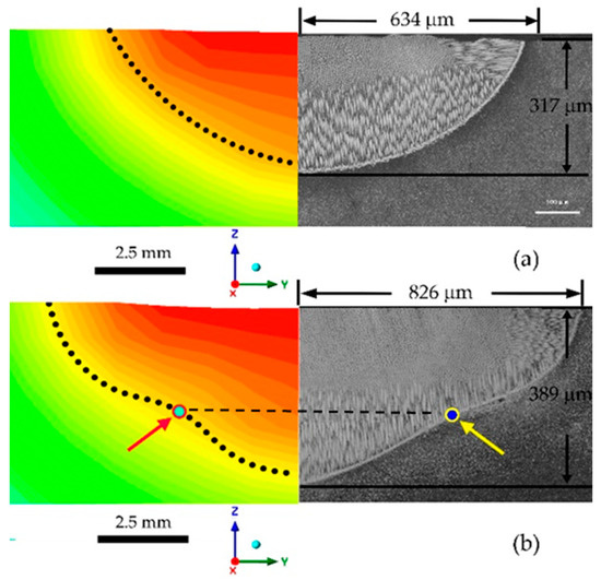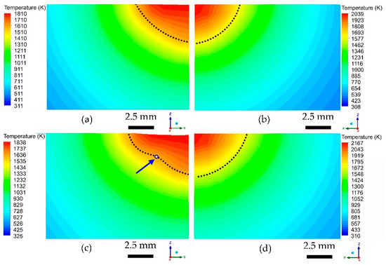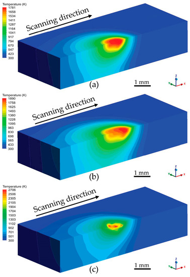 - For a fixed laser scanning speed of 2.5 mm/s, when the laser power is 350 W, the Peclet number is large, which means the thermal convection is strong; therefore, a “ω” shape is produced. When the laser power is 200 W, the Peclet number is smaller, indicating weaker thermal convection, which produces a semi-elliptical melt pool;