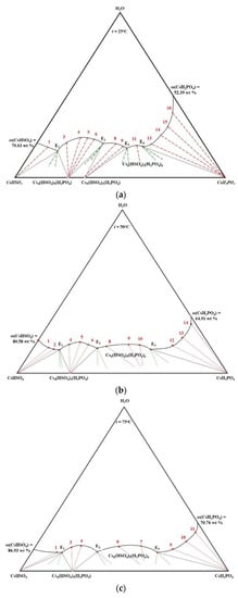 Phase equilibria in the CsHSO4–CsH2PO4–H2O pseudoternary cross-section at different temperatures: (a)—25 °C, (b)—50 °C, and (c)—75 °C.