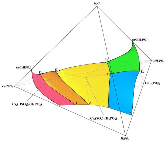 Thus, in the chosen concentration coordinates, during isothermal evaporation, the Cs6(SO4)3(H3PO4)4 compound is able to co-crystallize with the Cs4(HSO4)3(H2PO4) compound, provided that the solution is lacking in CsH2PO4 and H3PO4 (line E2-3). If CsH2PO4 is in excess, the Cs6(SO4)3(H3PO4)4 compound is expected to co-crystallize with CsH2PO4 (line E3-E5) until the composition of the solution reaches the E5 point of nonvariant equilibrium. At this point, the co-crystallization of three compounds, Cs6(SO4)3(H3PO4)4, CsH2PO4, and CsH5(PO4)2, will occur at once until water evaporates completely. If an excess of CsH5(PO4)2 is created in the solution composition (which is equivalent to an excess of H3PO4), the E5 point can be bypassed, and then co-crystallization will occur between the Cs6(SO4)3(H3PO4)4 and CsH5(PO4)2 compounds (line E5-4). All excesses in this case refer to the stoichiometric ratio of components relative to the Cs6(SO4)3(H3PO4)4 compound.