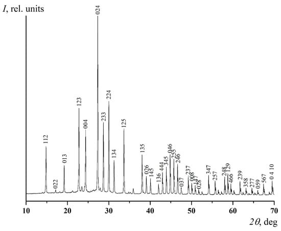 The obtained powder X-ray diffraction pattern of the grown crystal Cs6(SO4)3(H3PO4)4. The indexing was carried out in accordance with the data [].