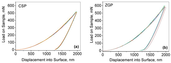Loading and unloading curves for (a) CSP and (b) ZGP. Each test is given in a different color.