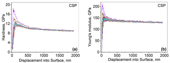 In Figure 3, the results for the nanohardness and Young’s modulus of CSP are shown. As can be seen, all of the tests overlap quite well, showing good reproducibility at depths above about 300 nm. The difference close to the surface might originate from surface scratches or some other imperfections. Hence, the average values for both quantities were taken in the range from 300 to 1800 nm. Table 1 includes the obtained average values together with some experimental details. The results can be converted to Knoop or Vickers hardness, so that the values correspond to 905 (Knoop) and 918 kg/mm2 (Vickers, VHN (kg/mm2) = 92.7 H (GPa)).