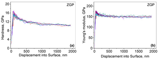 In Figure 4, the results for the nanohardness and Young’s modulus of ZGP are shown. Similarly to the previous case, all of the tests overlap quite well, except in the initial range up to about 300 nm. The average values for both quantities, taken in the range from 300 to 1800 nm, are given in Table 1. The results can be converted into Knoop or Vickers hardness, yielding values of 993 (Knoop) and 1066 kg/mm2 (Vickers).