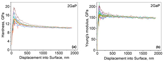 2GaP depth dependence of (a) nanohardness and (b) Young’s modulus. Each test is given in a different color.