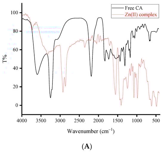The FT-IR spectra of the synthesized CA complexes: (A) Zn(II) complex, (B) Mg(II) complex, and (C) Ca(II) complex.