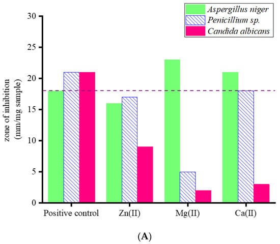 Diagram of the zone-of-inhibition diameter results for the positive controls, and the synthesized CA complexes: (A) Fungi species, (B) Gram-positive species, and (C) Gram-negative species.