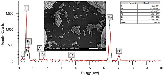 A number of iron filings resulting from blacksmithing waste was collected, which increase with the increase in cutting and polishing. This quantity was ground and sifted through a 65 diameter sieve. Before adding it to the epoxy, the shape of its particles was confirmed with an SEM “scanning electron microscope” [24] and the elements present and their ratio using EDX “energy dispersive X-ray” [25] analysis, as shown in Figure 1.