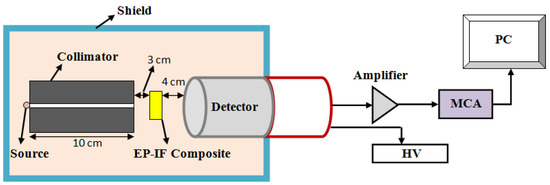 In the experimental measurements, a 3 × 3 inches high purity germanium (HPGe) detector was used for attenuation coefficient determination of EP–IF composites at different gamma-ray energies emitted from 60Co, 137Cs, and 241Am radioactive sources. The 60Co emits two lines (1.173 and 1.333 MeV), the 137Cs emits one line with an X-ray line (0.662 MeV), and the 241Am emits a single line (0.0595 MeV). The detector was connected to a high voltage, multi-channel analyzer, amplifier, and an electronic unit, as shown in Figure 2. The MCA was connected to the detector to generate digital signal spectra. This spectrum was carried out using Genie-2000 software on a computer connected to the HPGe detector system [26].