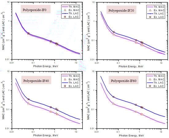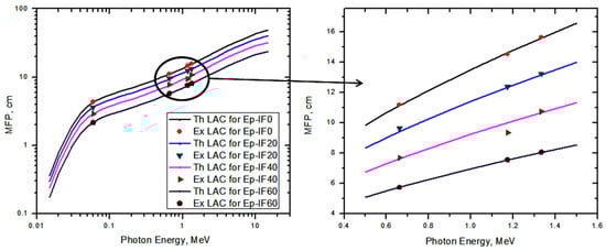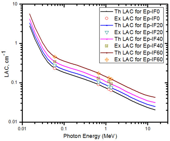 In Figure 4, we plotted the relation between the LAC and photon energy separately without the MAC. The results showed the superiority of the composite with the highest percentage of iron filings (Ep–IF60) in the attenuation coefficient (at all theoretical and experimental energies), while the lowest attenuation coefficient at all studied energies was for Ep–IF0. The theoretical values were calculated from 0.015 to 15 MeV photon energies. At the lowest studied energy (0.015 MeV), the LAC values were 2.7791, 3.3486, 4.2140, and 5.6961 cm−1 for EP–IF0, EP–IF20, EP–IF40, and EP–IF60, respectively, while at the lowest studied experimental energy (0.0596 MeV), the determined values were 0.2323, 0.2785, 0.3427, and 0.4573 cm−1, respectively.