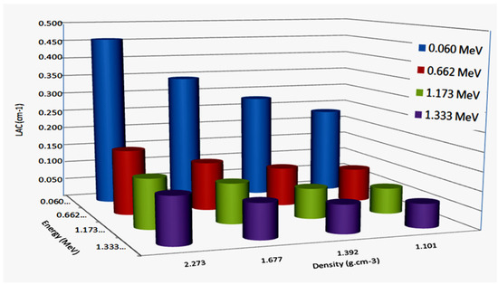 The experimental LAC as a function of density of epoxy–IF composites and photon energy.