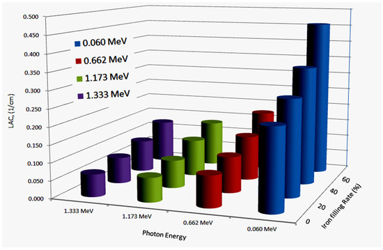 The LAC is affected by the density in a directly proportional manner, so the composites with the highest density have the highest rate of absorption or attenuation of the incident photons, as shown in Figure 5. In the studied epoxy composites, the density of present composites increases with the increase of the added iron filings; therefore, the higher concentration of the iron filings, give higher LAC in the studied composites as shown in Figure 6.