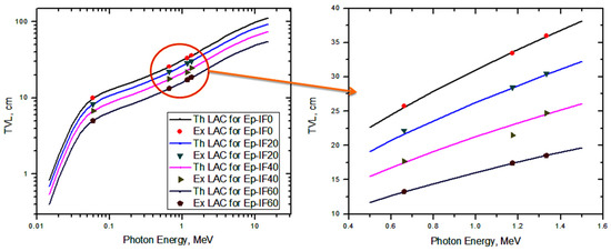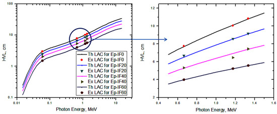 The MAC and LAC were experimentally determined according to the experimental section, and the data were compared with the theoretical results estimated from Phy-X online software. The results are presented in Figure 3 for four epoxy composites: Ep–IF0, Ep–IF20, Ep–IF40, and Ep–IF60. The results in Figure 3 show first the extent of the accuracy of the experimental results due to the presence of agreement between the experimental points with the theoretical lines of the four compounds. The second thing, which is normal, is that the values of both the MAC and the LAC decrease with increasing photon energy. This is because, at each region, one of the interactions is dominant over the other, since at low energies, the photoelectric absorption is dominant. Thus, at medium energies, the Compton interaction is the most dominant, while at higher energies, pair and triple production interactions are present. For example, at 0.0595, 0.6617, and 1.1732 MeV for Ep–IF20, the values of MAC were 0.2095, 0.0781, and 0.0639 cm2/g, and the values of LAC were 0.3427, 0.1301, and 0.1071 cm−1, respectively. Thirdly, with the increase in the percentage of iron filings in the epoxy composites, the difference in the MAC and LAC experimental and theoretical lines increases. This is because the results of the LAC depend on the density of the composite, since higher density results in a higher linear absorption coefficient (LAC). This is evident in Figure 4, for example, at an energy of 0.6617 MeV, the increasing percentages between the MAC and LAC values for Ep–IF0, Ep–IF20, Ep–IF40, and Ep–IF60 were 10.0, 32.9, 67.7, and 127.3%, respectively. These percentages are constant at all energies because the MAC is multiplied by a fixed amount (density).