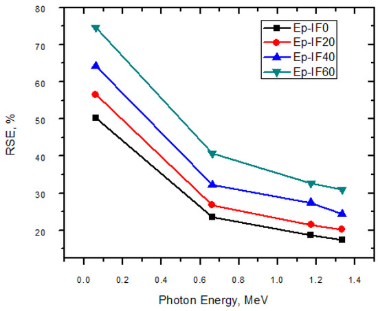 The experimental RSE as a function of photon energy of epoxy–iron filing composites with 3 cm thickness.