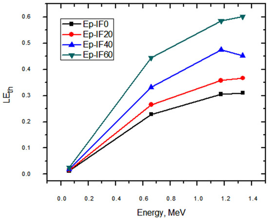 The radiation shielding efficiency (RSE) of the epoxy–iron filing composites was experimentally determined at 0.0596, 0.6617, 1.173, and 1.333 MeV within 3 cm thickness of all discussed composites. A higher RSE corresponds to the highest rate of iron filings added at all studied energies, as shown in Figure 10. In addition, RSE is inversely proportional to the increase in energy, so at the energy of 0.0594 MeV, the shielding efficiency is about 75%, while at the energy of 1.333 MeV, it was approximately 31% for the same composite (EP–IF60). The lead equivalent thickness (LEth) is one of the most essential factors that must be discussed for the studied composites because the main reference used as a shielding material is lead, but due to its high cost in addition to the toxicity it causes, we resorted to materials that are environmentally friendly and less expensive, even if they are thicker than the lead used. We determined the LEth for all fabricated reinforced epoxy composites at different experimental energies, as shown in Figure 11, and observed that at the highest energy (1.333 MeV), 3 cm of Ep–IF60 (40% epoxy + 60% iron filings) gives the same efficiency as 0.6 cm of lead. This means that if the required thickness of the prepared compounds to reduce the intensity of photons with energy of 1.333 MeV to 50% is 5.5760 cm, then it corresponds to 1.1152 cm of lead. Likewise, the thickness that reduces the intensity of these photons by 90% for Ep–IF60 is 18.5231 cm, which is equivalent to 3.705 cm of lead. Although there is a 5-fold difference in the thickness used, the cost of forming the epoxy mixture is lower, in addition to its safe use.
