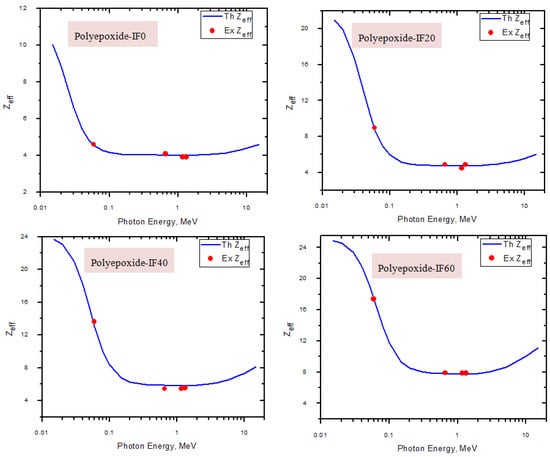 The effective atomic number (Zeff) of the epoxy–iron filing composites was determined experimentally at 0.060, 0.662, 1.173, and 1.333 MeV and theoretically at the range of 0.015–15 MeV, as shown in Figure 12. At the lowest theoretically calculated energy (0.015 MeV), we found that the composites containing the highest rate of iron filings had the lowest Zeff, while the free epoxy resin composite had the highest Zeff, which is due to the mass attenuation coefficient at this energy being higher in the free epoxy than the rest of the composites containing iron filings. At higher energy levels (starting from 0.02 MeV), and up to 15 MeV, we found that the Zeff increases with the increase in the rate of iron filings. At an experimental energy of 0.662 MeV, the Zeff values were 4.59, 4.94, 5.62, and 6.38 for EP–IF0, EP–IF20, EP–IF40, and EP–IF60, respectively.